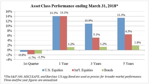 Global stock markets moved modestly higher during the first quarter of 2018. For the first time in more than a year, day-to-day stock market volatility has returned to historically normal levels. Last year was unusually calm as markets moved steadily higher throughout most of 2017 with minimal interruption. In fact, 2017 was the least volatile stock market year since the CBOE’s Volatility Index was established in the early 1990s. With that context, we view recent stock market movements as rather normal. We encourage our clients to avoid focusing on the short-term market “noise” and instead look to the fundamentals of the economy and the companies we follow. From our perspective, corporate earnings were quite strong in the fourth quarter of 2017, which portends well for this year and next, particularly when you factor in the tailwind of corporate tax reform.