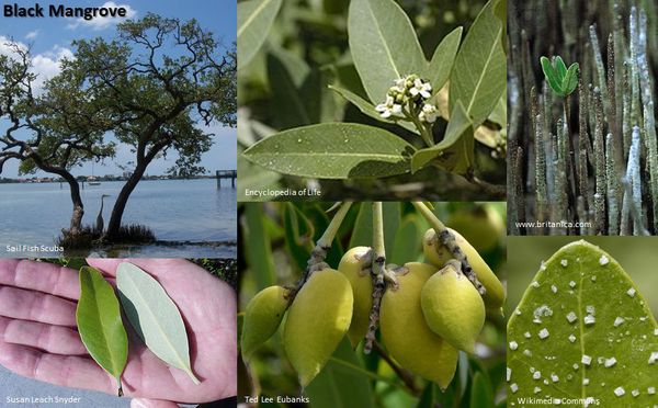 Black mangroves (Avicennia germinans) with their dark bark and two-toned leaves, green on top and silvery undersides, are salt extruders – the trees take in saltwater and expel salt through small openings on the surface of the leaf. As the water evaporates, salt crystals are left. Pneumatophores, pencil or straw-like projections, along the horizontal roots are like breathing tubes for the tree and conduct oxygen to the underground root system. Black mangroves are the most cold tolerant of the three species and can extend much farther into the “frost zones.”