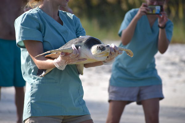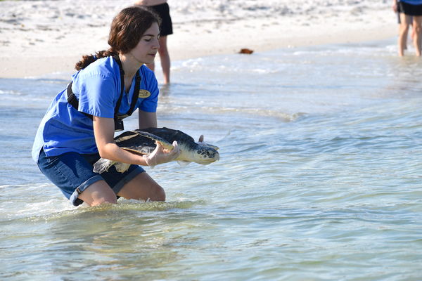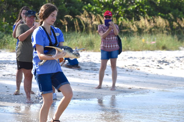 The Clinic for the Rehabilitation of Wildlife released two critically endangered Kemp’s ridley sea turtles today at Delnor-Wiggins Pass State Park in Collier County. The first of the two turtles, released by veterinary intern Dr. Malka Spektor, was admitted on July 2 after it had sustained what appeared to be a boat strike injury near Redfish Pass on Captiva. Members of Sanibel-Captiva Conservation Foundation’s Turtle Research Program transported the turtle to CROW. Sea turtles can often become the victim of boat strikes or predator attacks as secondary injuries when they are debilitated by red tide poisoning. The second turtle, released by student Emily Brady, was admitted on June 28 after it was found struggling in the water near the Boca Grande causeway. It was transported to CROW by volunteers of the Boca Grande Sea Turtle Association. The turtle was suspected to be suffering the effects of brevetoxicosis, also known as red tide poisoning. It was treated for red tide poisoning using supportive care and a novel treatment as part of an ongoing study in collaboration with the Loggerhead MarineLife Center in Juno Beach. If anyone were to come across a debilitated, injured or dead sea turtle, they are asked to report it to the Florida Fish and Wildlife Conservation Commission at 1-888-404-FWCC (3922), SCCF’s Sea Turtle Hotline at 978-728-3663 or CROW at 239-472-3644.