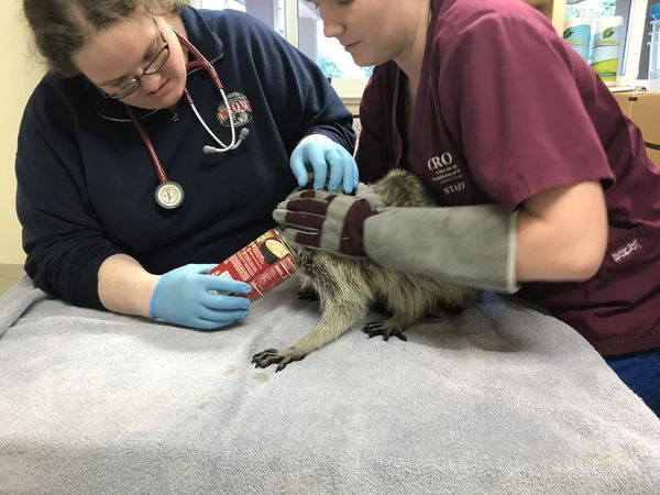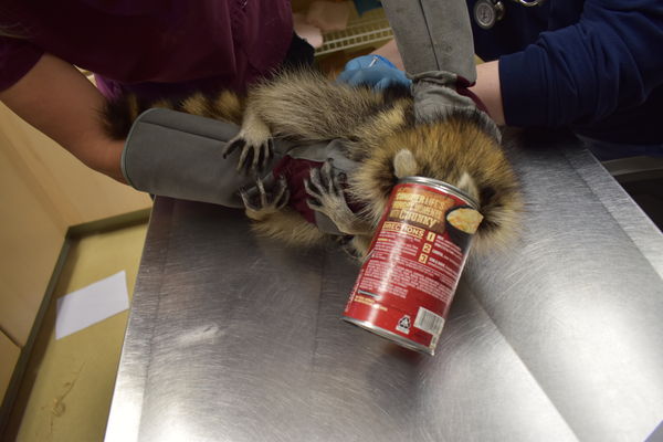 Concerned with his ability to breathe, the veterinary team immediately used a can opener to remove the bottom of the can. The raccoon was then given sedation medication so they could safely cut the can away. However, as soon as the medication began to take effect, the raccoon relaxed and the can easily slipped from his head.