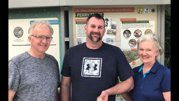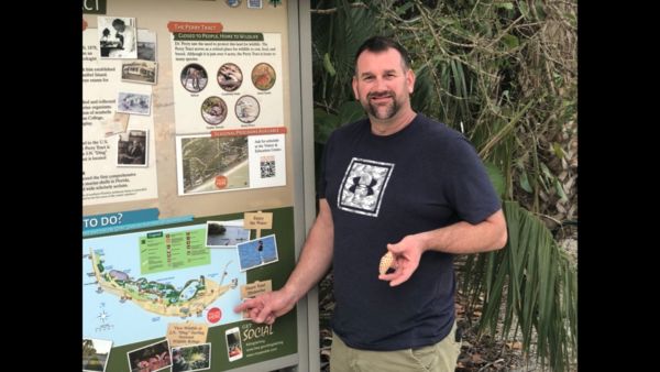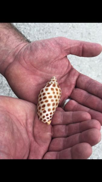 Jacob Mouw, 41, of Whitehall, Michigan, found a junonia shell on Jan. 9 at Gulfside City Beach Park on Sanibel, about 100 yards east of the east entrance to the parking lot. The shell was buried about six inches under the sand, which Mouw found while using a small garden rake to uncover shells. Having just finished digging in the area, two Shell Ambassadors were nearby. They explained to Mouw and his wife, Theresa, what they had found. The family reported that they were very excited to learn what they had uncovered. Mouw and his wife have been visiting his mother, Diana, and Allen Alexander annually since they moved to the area four years ago. The family added that Mouw, a “wanna-be archaeologist and now shelling expert,” and his wife search for shells and sea glass frequently along the east side of Lake Michigan from Muskegon to Manistee.