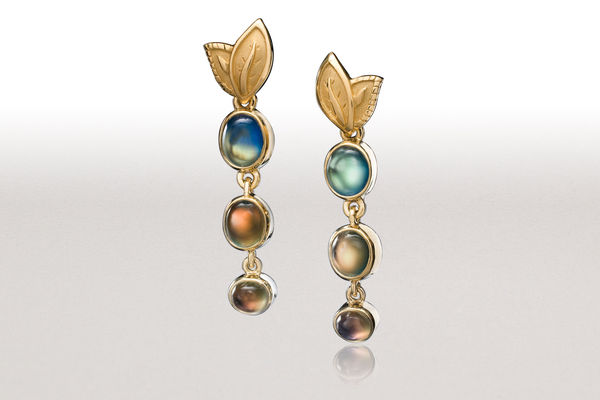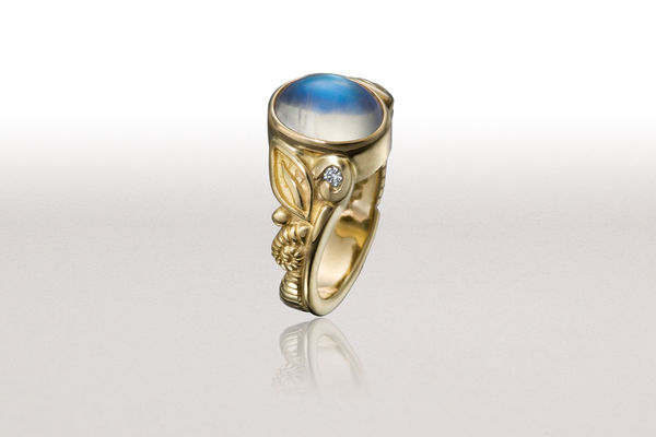 Nature inspires Mainne, especially the verdant environment of California’s North Coast. Working out of her studio in Mendocino, the shapes found in botanicals, the surf, nautilus, clouds, stars and moon infuse her work with a mystical quality of the natural world. Moonstones are an integral aspect, favored for their color and sense of mystery. The gems, along with aquamarines, tourmalines, sapphires, pearls and diamonds, are adorned with her metalwork in 18-karat gold and silver.