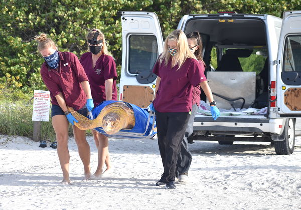 An adult female loggerhead sea turtle – the largest of the hard-shelled turtles and frequent nester on Southwest Florida beaches – was released from the Clinic for the Rehabilitation of Wildlife today after it was accidentally caught by an angler.