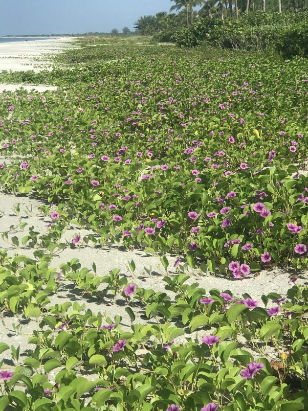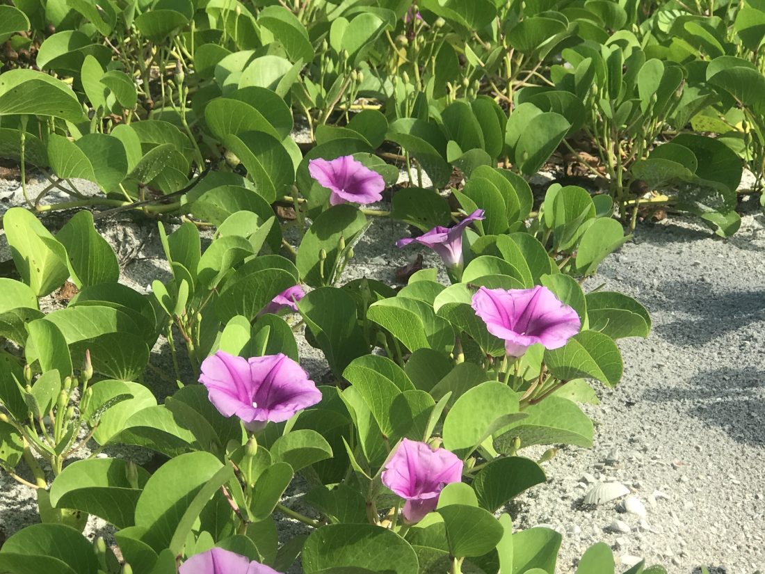 The railroad vine is one of the most widely distributed beach plants. It grows all around the world limited only by temperature as it does not tolerate frost. The railroad vine is part of the morning glory family and, as expected, the flowers only last a day. The flowers, even though short-lived, attract many pollinators, such as bees, butterflies, moths, wasps and ants. The bright purple color and easy growing make it a nice addition to a home landscape. The seeds of the railroad vine are very light and small, making the winds and water excellent dispersal methods. It can grow year-round as long as there is water to keep it growing. And, keep growing it does. The branches of the vine may reach more than 30 feet long. The roots of the railroad vine will generate wherever the leaf connection touches the ground, enabling the plant to form large mats. The mats help make the railroad vine useful in stabilizing sand dunes and preventing coastal erosion. They also have substantial indirect economic benefits. It grows just above the high tide line and can create large mats of lush green leaves and vibrant purple flowers.