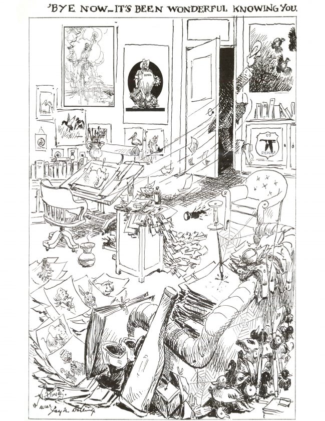 In 1962, at the age of 86, Jay Norwood “Ding” Darling penned this farewell cartoon that appeared on the front page of the Feb. 13 edition of the Des Moines Register, in the very place his cartoons had appeared daily for 50 years. Titled “‘Bye now — it’s been wonderful knowing you,” it depicts him exiting his studio in Iowa. The J.N. “Ding” Darling National Wildlife Refuge, which Darling created as the Sanibel National Wildlife Refuge in 1945, displays an interactive exhibit of his studio. This year, the refuge celebrates its 75th anniversary on Dec. 1. One goal of the celebration has been to raise awareness of Darling, considered a legend in the annals of conservation history. To learn more about his accomplishments, visit dingdarlingsociety.org/articles/our-namesake.