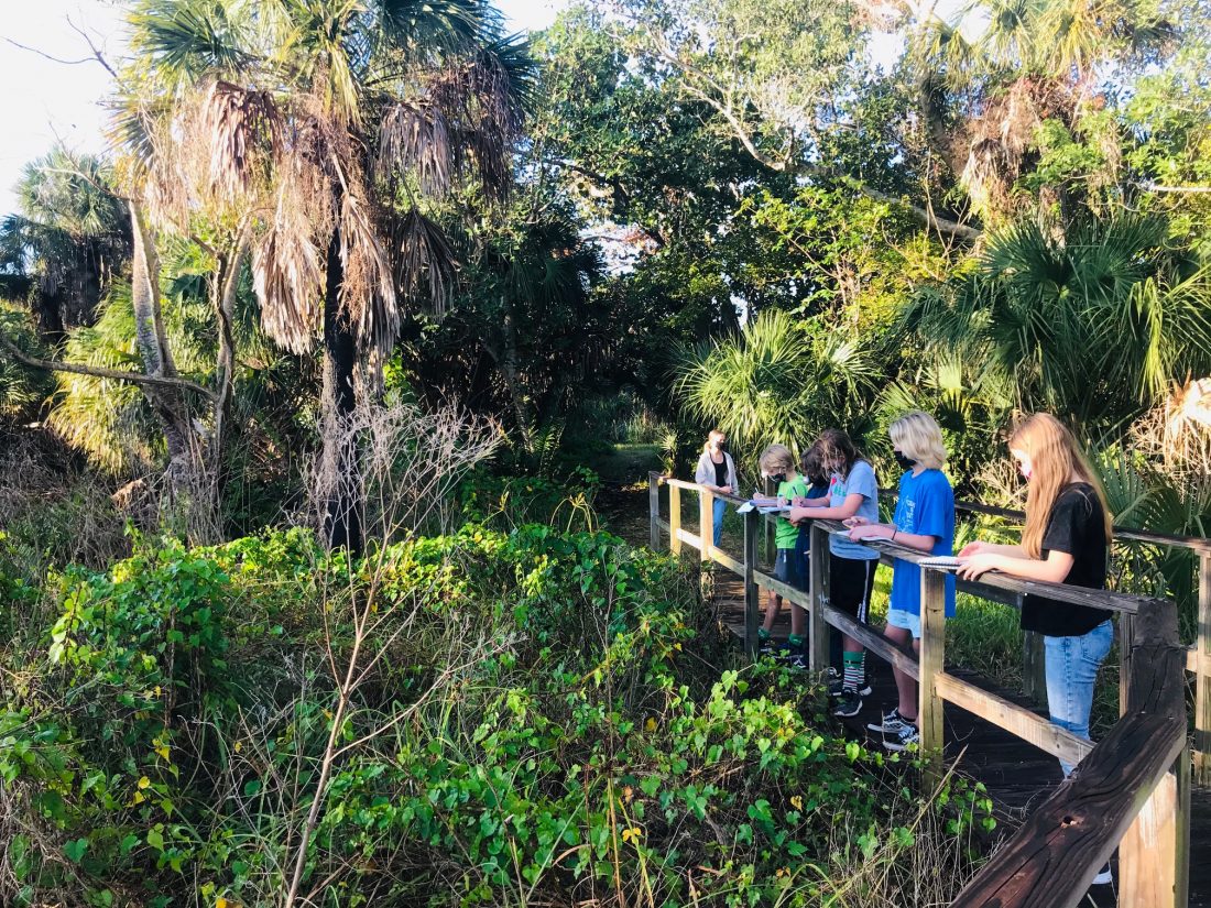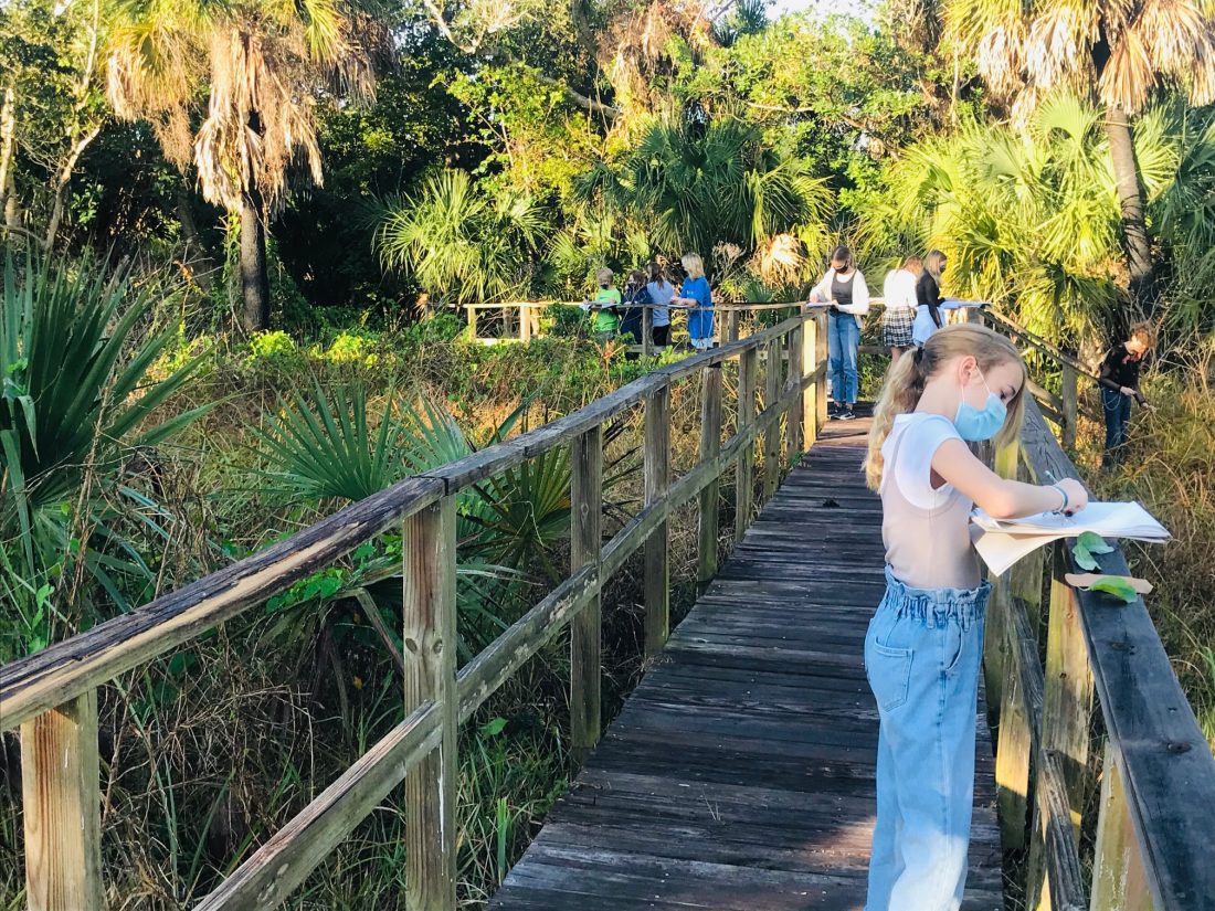 The Sanibel-Captiva Conservation Foundation’s Pick Preserve, located across the street from The Sanibel School, recently served as the perfect setting for a middle-school art class. Erica Sharp’s art students, observing shapes and structure in nature, sketched plants and trees. They also made leaf rubbing collages.