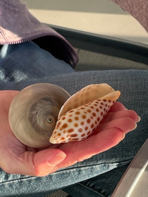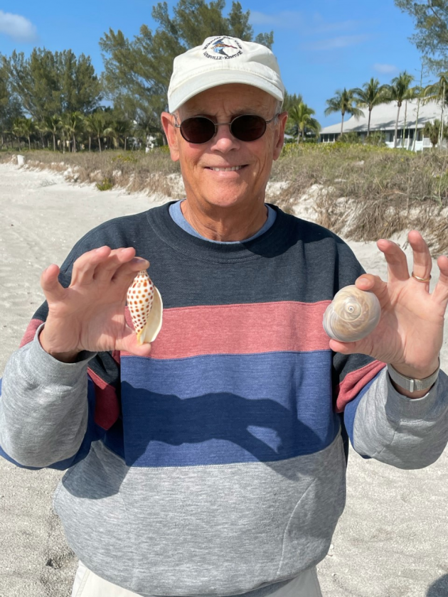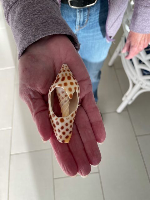 Sherm Bedford, of Prospect, Kentucky, reported that he and his wife, Pat, walk the beach at the South Seas Island Resort on Captiva at least twice a day. During their morning walk on Feb. 4, he spied a large shark’s eye shell to add to their collection. Then later in the afternoon, Bedford found a junonia measuring about 3 1/2 inches in length. He reported that it was the first time they had seen one in their 17 years of walking that beach and they were amazed. Bedford added that the junonia was just sitting there among the other shells at the high water mark, and he and his wife wondered how many other folks had walked past the amazing shell and not seen it.