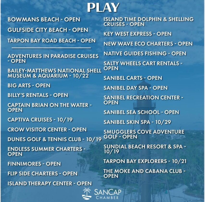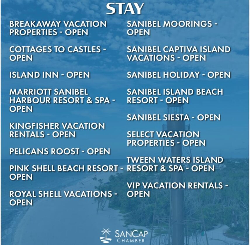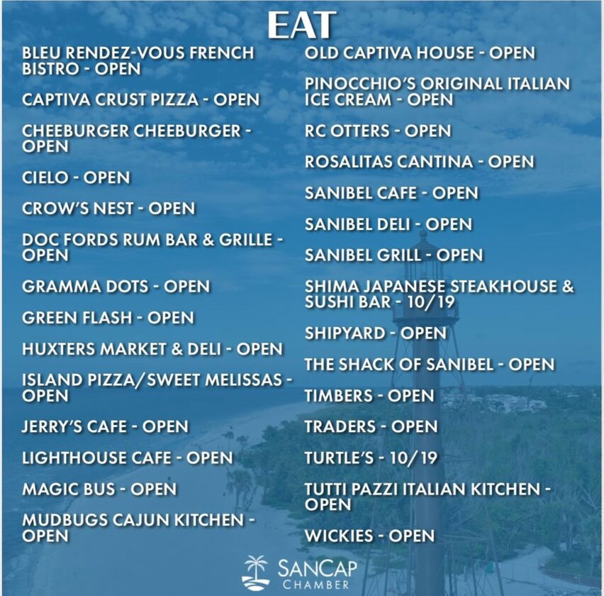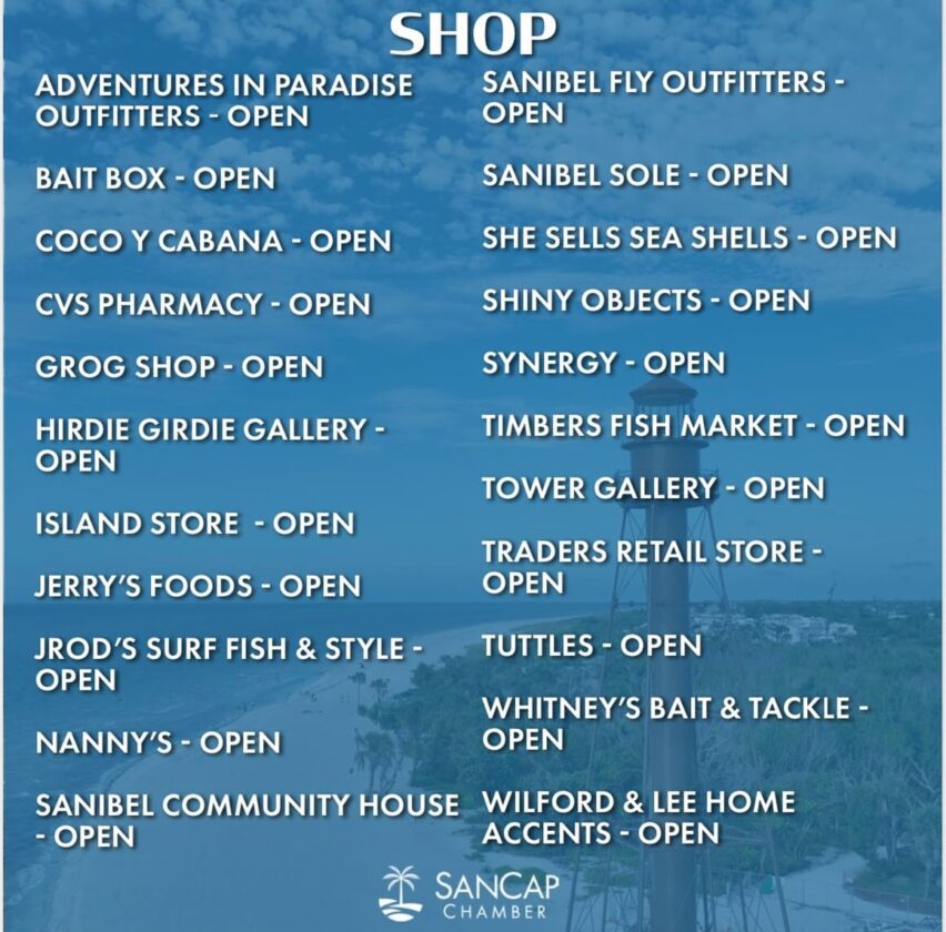 Today, Oct. 18, the SanCap Chamber provided a list of businesses that have reopened post-Hurricane Milton. The public can also visit tinyurl.com/sancapwandermap. Open businesses not on the list can contact the chamber to be added.