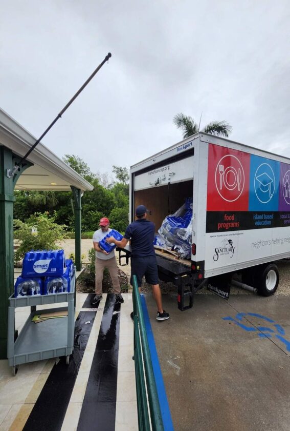 FISH has set up a Point of Distribution (POD) at The Community House on Sanibel, complete with an emergency food pantry pop-up, ice, water, Publix gift cards, cleaning supplies, tarps, and specialized disaster kits for seniors.