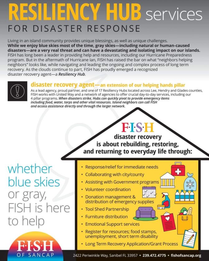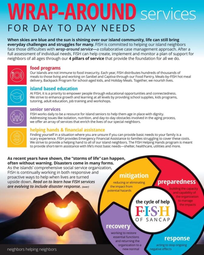 If you or someone you know is in need of assistance, FISH’s 24-hour phone line is staffed and ready to respond to community needs. Call 239-472-0404 or email info@fishofsancap.org.