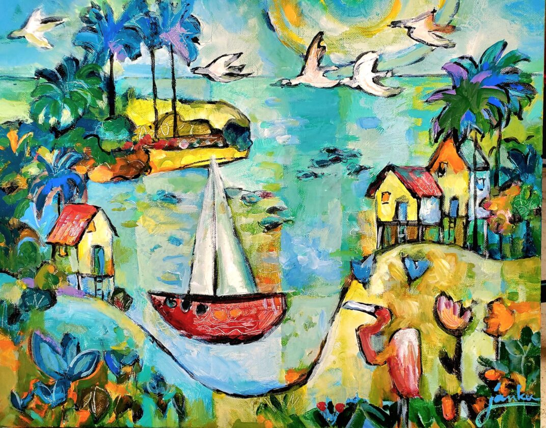 “Sissi Janku’s island inspired canvases bring you a symphony of color and light. Joan Klutch’s abstract expressionism evolves as a poetic visual language. Terrie Mertens stone carved sculptures add texture and three dimensional artwork to the mix,” the CCA shared.