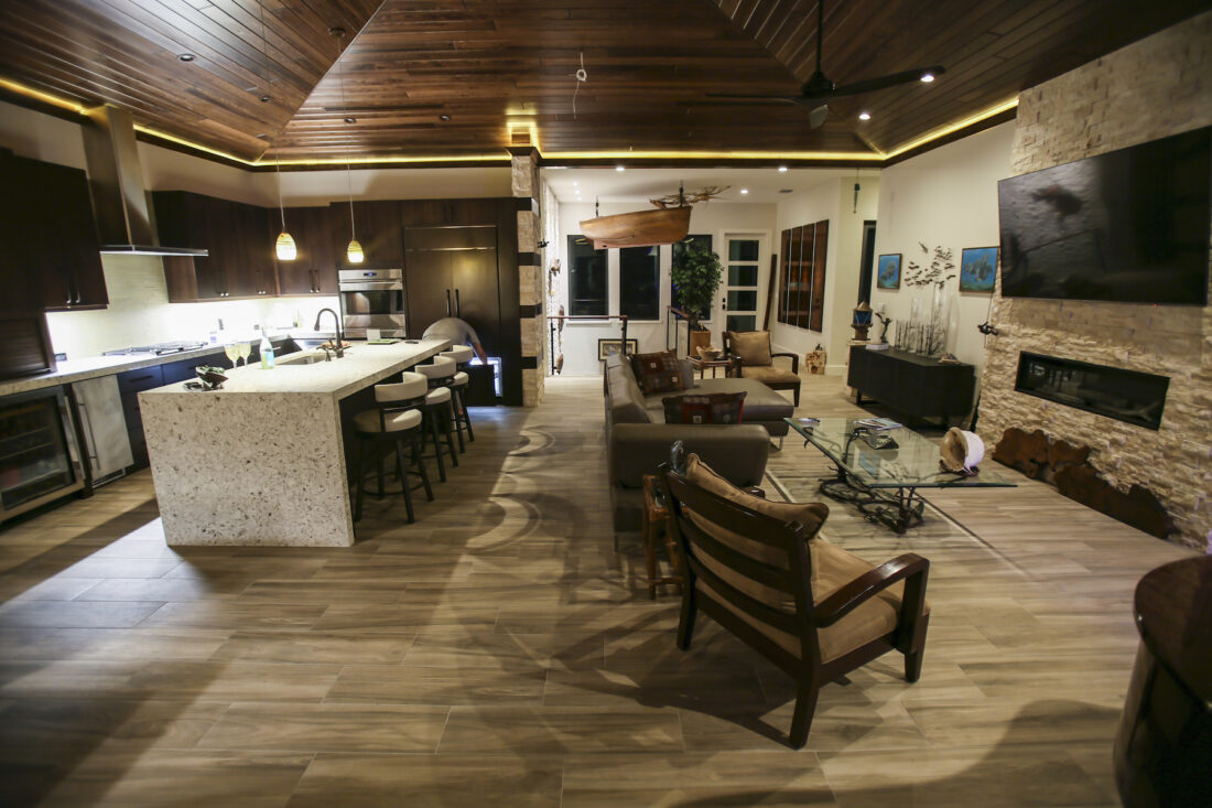 Next, on Pine Tree Drive is a home designed and built by wildlife photographers Dick Fortune and Sara Lopez. “In Dreams” is a testament to resilience planning and survival, featuring open living space that supports the homeowners’ love of hospitality.