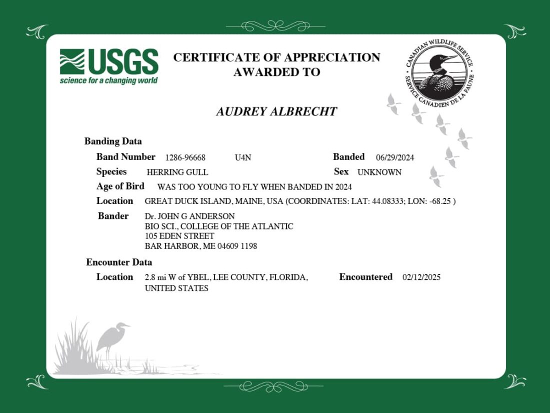 After reporting the juevenile herring gull’s band to the U.S. Geological Survey’s Bird Banding Laboratory, SCCF shorebird biologist Audrey Albrecht received a certificate stating the bird had been banded in June on Great Duck Island, Maine, by a researcher from the College of the Atlantic.