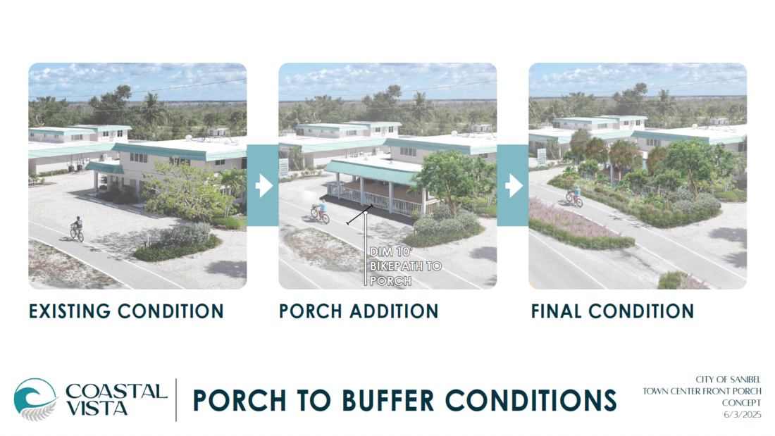 – The council held the first reading for an ordinance to amend the Code to consider front porch additions within the Town Center Commercial Districts to promote community resiliency through revitalization. Prior to the reading, the council discussed the draft legislation. Staff also shared an example of improvements created by Coastal Vista Design for its office at 2415 Palm Ridge Road supported by the proposed ordinance if implemented. The second reading will be held on July 15.