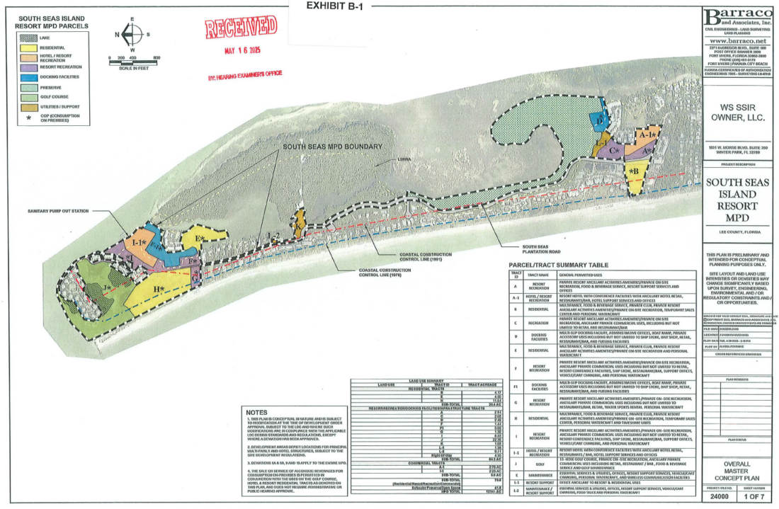 Per the application, South Seas requested that about 120 acres be rezoned from Residential Multiple-Family, Marine Commercial and Two-Family Conservation to Mixed Use Planned Development to allow for “a maximum of 193 multiple-family dwelling units and 435 hotel units with accessory uses and structures, common infrastructure, and resort amenities.”