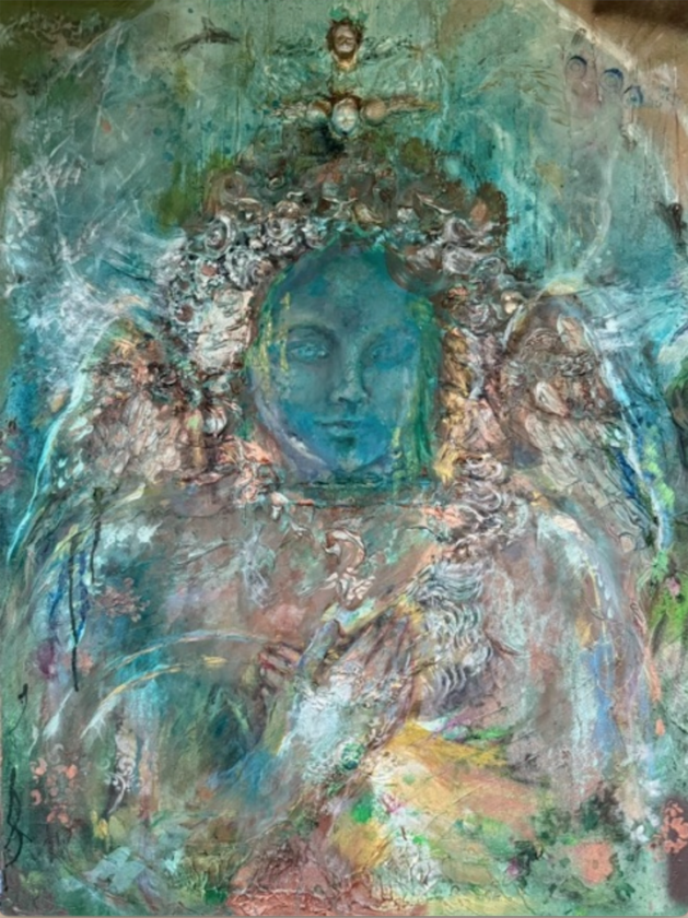 “Ilie’s angels and mermaids transform and rise onto canvas from both her inner knowing and from the faces of those who came before. They belong to the island’s long-watch guardians,” McCraney said. “Formed by storm and return, erosion and renewal. Standing within its rhythms, they bear witness to what endures. They illuminate abundance with sunrise and moonrise, and settle the calm of knowing with the sunsets and constellations.”