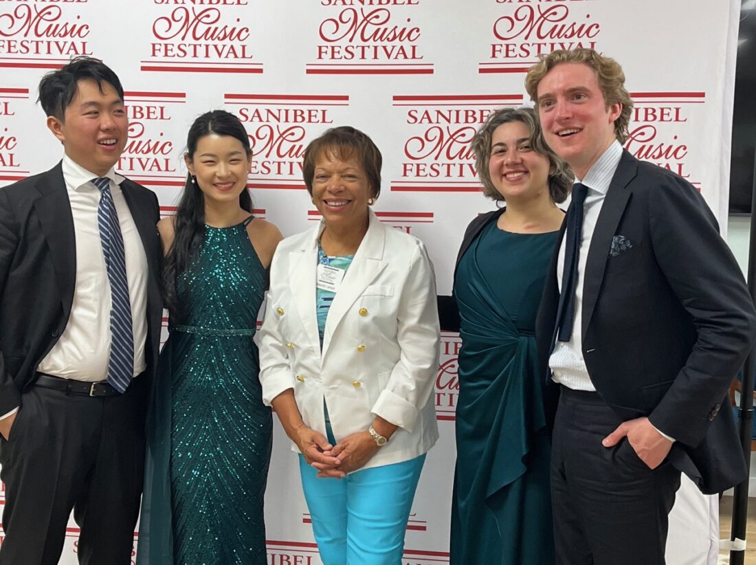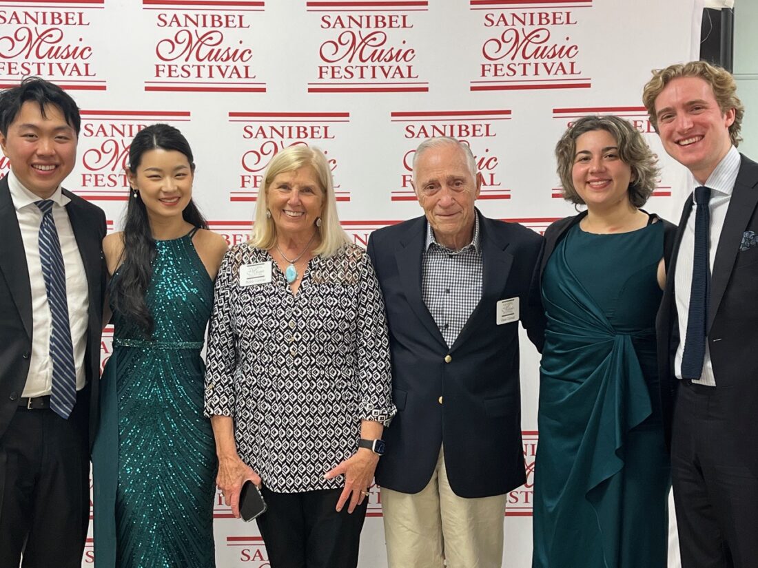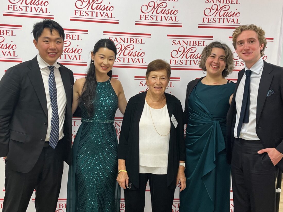 The Sanibel Music Festival continued its 39th season with the Viano Quartet on March 10 at the Sanibel Congregational United Church of Christ on Sanibel. Violist Aiden Kane, violinists Lucy Wang and Hao Zhou, and cellist Tate Zawadiuk delighted attendees with a varied display of their talents. The program selection and order were devised by the Chamber Music Society of Lincoln Center, starting with Haydn Quartet in D Major Op 76 No 5, followed by Mendelssohn String Quartet No 3 in D Major Op 44 No 1. A more contemporary Langsamer Satz by Webern opened the second portion of the concert, followed by a fiery and virtuosic Shostakovich String Quartet no 9 in E flat major Op117 as the finale. Festival board members and major donors and hosts for the artists enjoyed informal conversation with the quartet at the Afterglow afterward, along with wine and hors d’oeuvres. The annual festival took place from March 3-24 on select Tuesdays and Saturdays at the church.