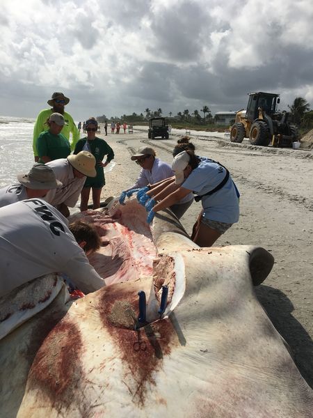 Mote Marine Laboratory Dr. Bob Hueter explained that the organization was alerted when the body was discovered and he monitored the situation via phone through the Bailey-Matthews National Shell Museum. Museum staffers were conducting a public beach walk the morning the animal was found.