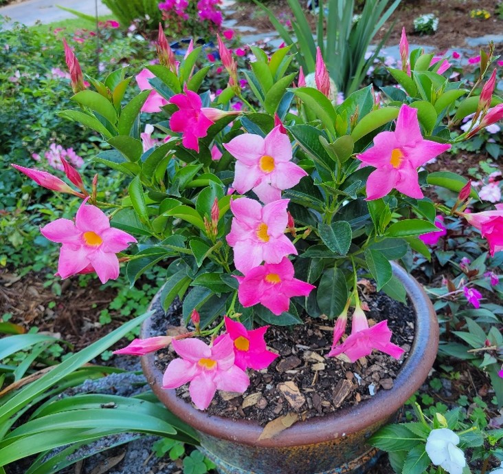 Picture a plant so loaded with blooms that you hardly notice the glossy green leaves. That is the perfect description for a dipladenia (Mandevilla sanderii). The dipladenia is a spring favorite in the United States and never more welcome than right here in Florida. The little plant embodies everything we love in a tropical flowering plant. From its glossy dark green leaves to the profusion of flower and buds in bright pinks, reds or white, the plant signifies the celebration of spring.