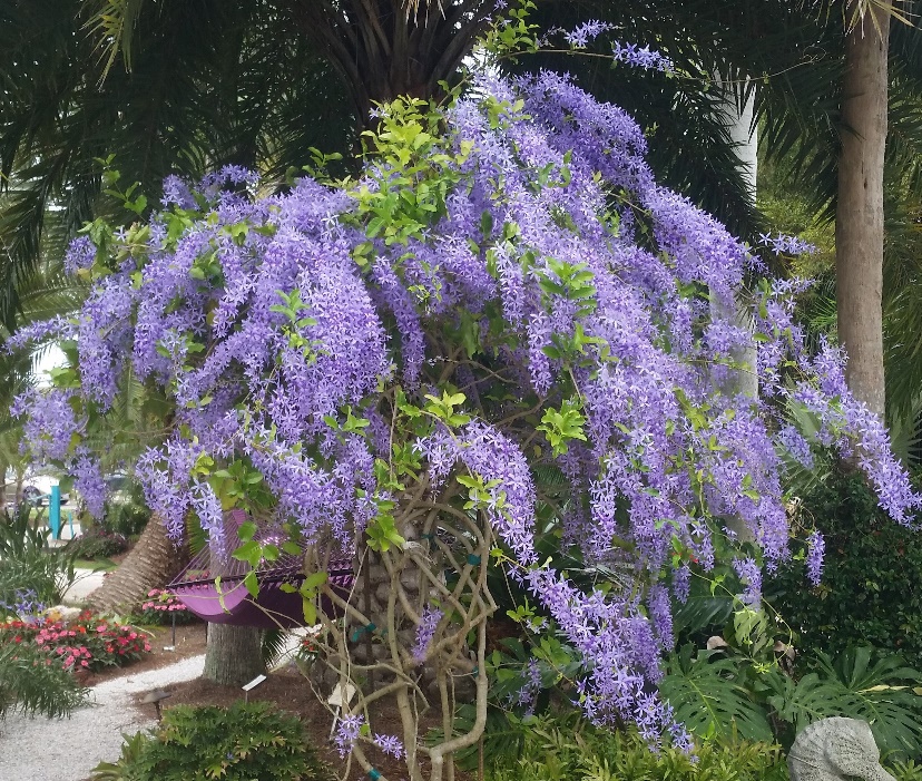 The Queen’s wreath vine (Petrea volubilis) plants native to Cuba and the Central Americas and is well known for its profuse purple blooms between February and June. We typically use it as an ornamental accent vine in our gardens that will grow up onto palm trees, gates, walls and arbors to give additional visual interest.