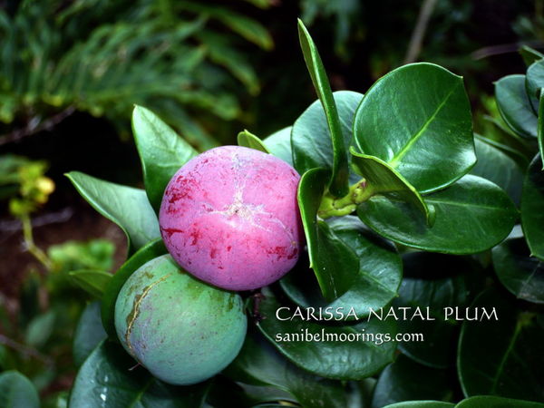 Upon further investigation: Carissa is considered a great addition to your coastal garden. It adds a dark green compact shape with lots of grit against strong winds and salt spray. Its dense foliage makes it a good screen, and its thorns make it a stay away barrier as well. It can be pruned to any size. Patience is the key because of its slow growth, it’s a great plant to grow and shape as your garden grows with time. Considered a medium sized shrub, our tallest one is about 12 feet tall. Nowadays, more cultivars are available to us in dwarf sizes, horizontal ground covers, thornless, and with spiral flowers. The fragrant tiny flowers are cameo white and pack an olfactory wallop of fragrance,which intensifies at night. Take a flower and rub it on your wrists… oohh! The flowers are a super pollinator attractor; everyone takes advantage of the nectar. Remember I mentioned large fruits? They are edible! Natal plums start out green then turn a reddish crimson hue when ripe. To me, they taste very tart and remind me of cranberries. Like most tart fruits, can be transformed into unique pies, jams, jellies, and sauces. One drawback of our star is that the tasty plum is the only plant part that is not poisonous. Like many plants of the Carissa species, the white milky sap of the leaves can make you ill. Wear gloves, wash your hands, and never ingest this ooze, it has a highly-toxic quality. You will appreciate this plant’s easy nature and lack of pests and disease. The mature plants occasionally will get a branch area that turns completely black and necrotic, just prune away. Made for our tropical climate, easy care, drought tolerant, and can take full sun. It is a non-native species, which hails from the South of Africa where it is grown as an edible crop.