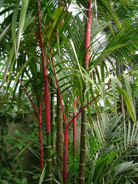 The lipstick palm, also known as red sealing wax palm or rajah, is an ornamental palm. With striking bright red crown shafts, leaf sheaths and a bamboo-like appearance, it makes a visually pleasing addition to a palm garden or tropical landscape.