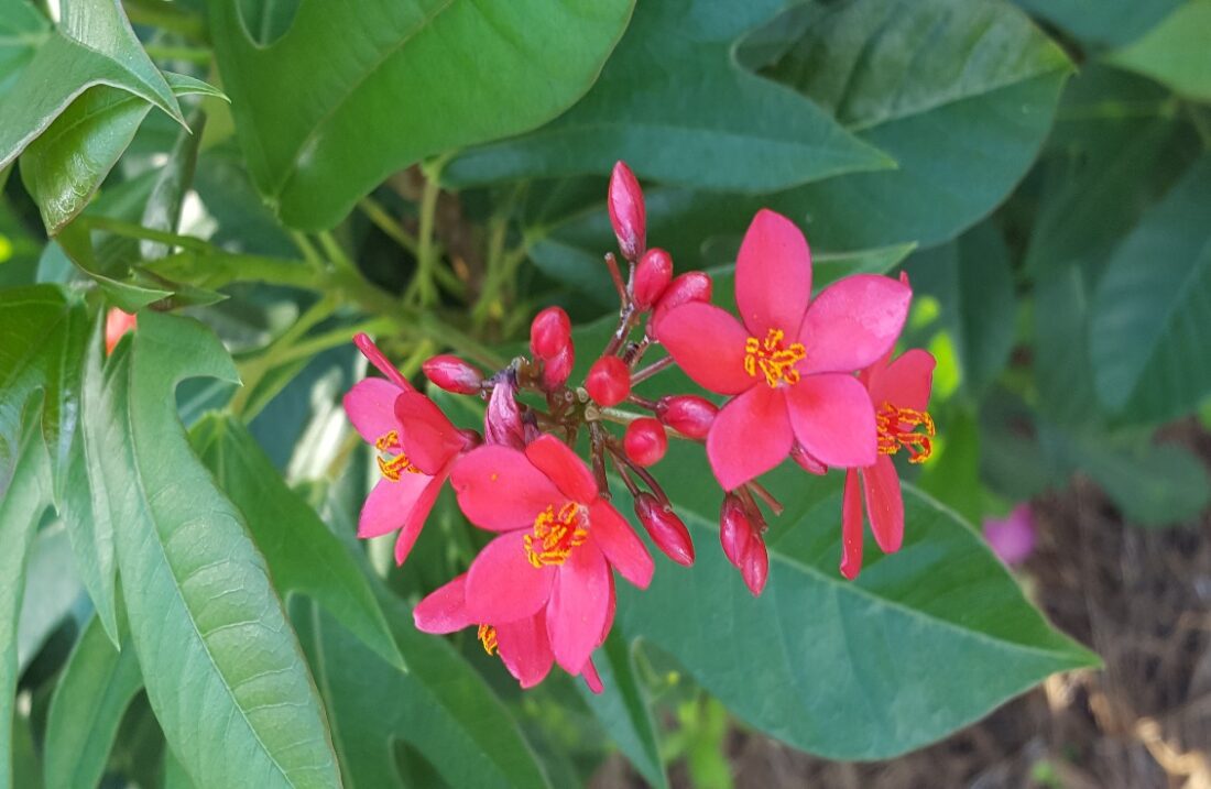 Jatropha is a genus of flowering plants in the Euphorbiaceae family. Butterflies love the plant, which can be both a flowering shrub or grown as a standard or tree form. Jatropha has dark green leaves and regular splashes of a pinkish-red to deep red clusters of blooms all through the foliage.